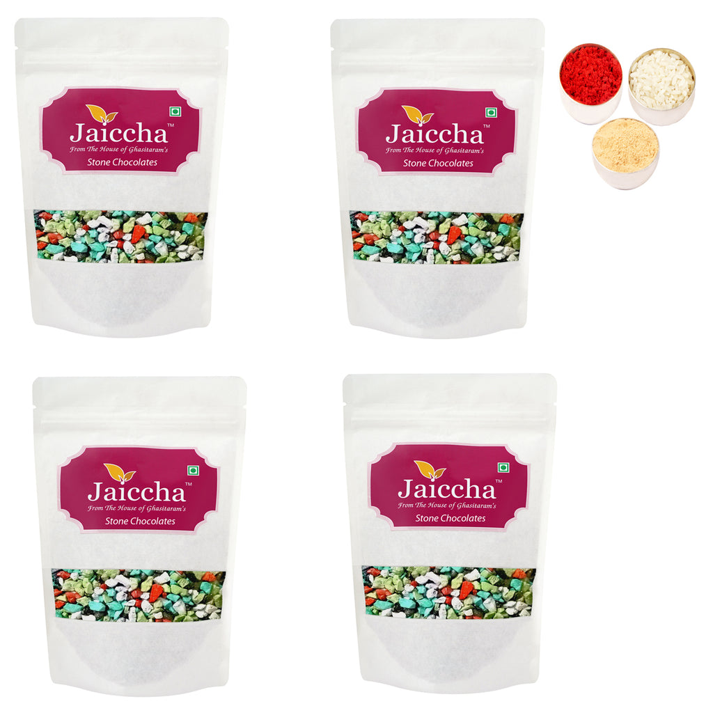 This unique stone chocolate is made of premium milk chocolate and coated with colours to give a texture like stones/ rock, thus called Stone/ Rock Chocolates.Net Weight: 200 gms. Contains Oxygen absorber pouch to retain its freshness and an extended shelflife. Packed in 100 percent Bio- Degradable Zip Lock Paper Pouches . Free Roli, Chawal and chandan pouches go along with this product.