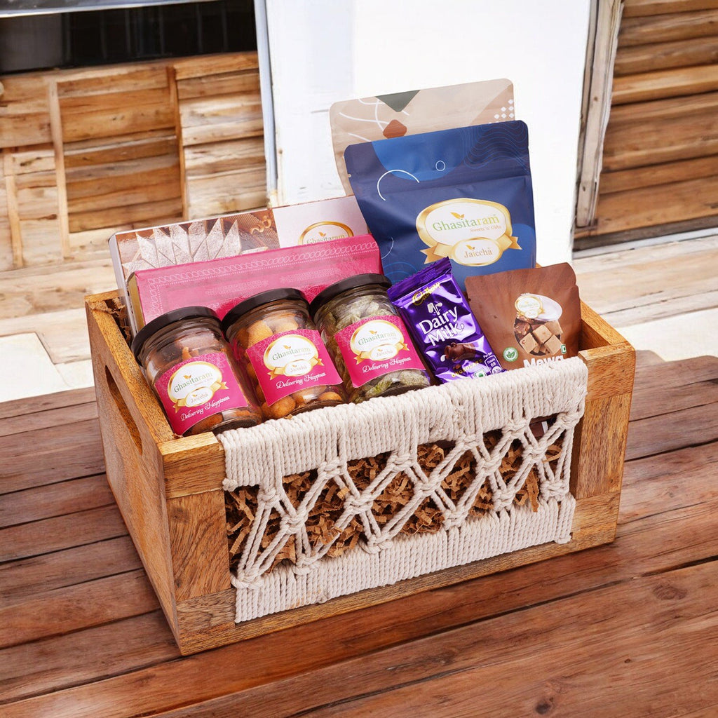 A Woodedn Jute Rectangle Basket of containing a pack of Ready Cappuccino (124 gms), A Pack of Green Tea (50 gms), A bottle of Hazelnut Chooclate Spread (350 gms), and 2 jars of Crunchy Cashews (70 gms), Paan Raisins (70gms) and 2 jars of Salted Wheat Puffs (25 gms) and Moong Chakli ( 75 gms).