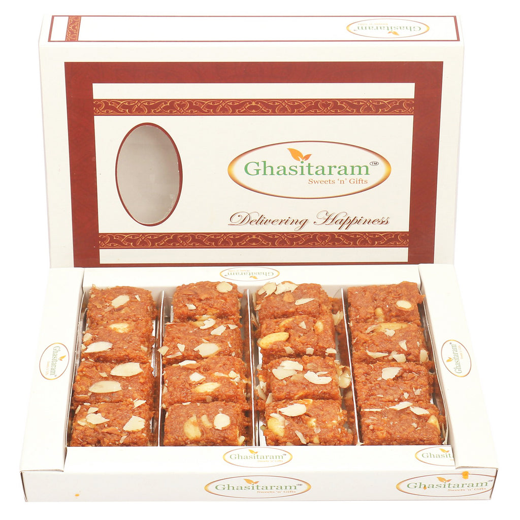 A 4 generation old specialality made Sprouted whole wheat flour, Milk, sugar,Curds,Semolina,Condiments,Dryfruits and Ghee.This mithai has been specially packed using Italian technology for an extended shelflife.