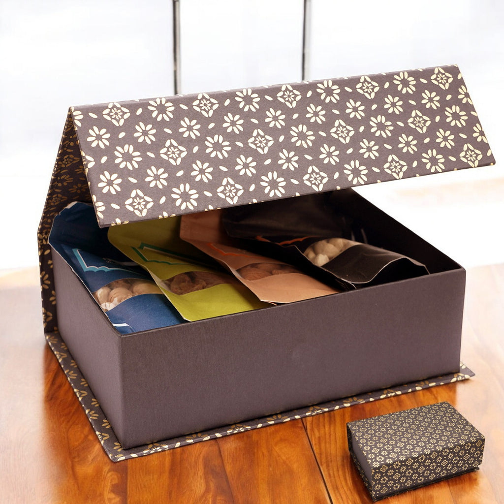 A beautiful Reusable box containing a pouch of Almonds (100 gms), a pouch of Raisins (100 gms), a pouch of pistachios (100 gms) and a pouch of Cashews (100 gms). Net Weight: 400 gms.