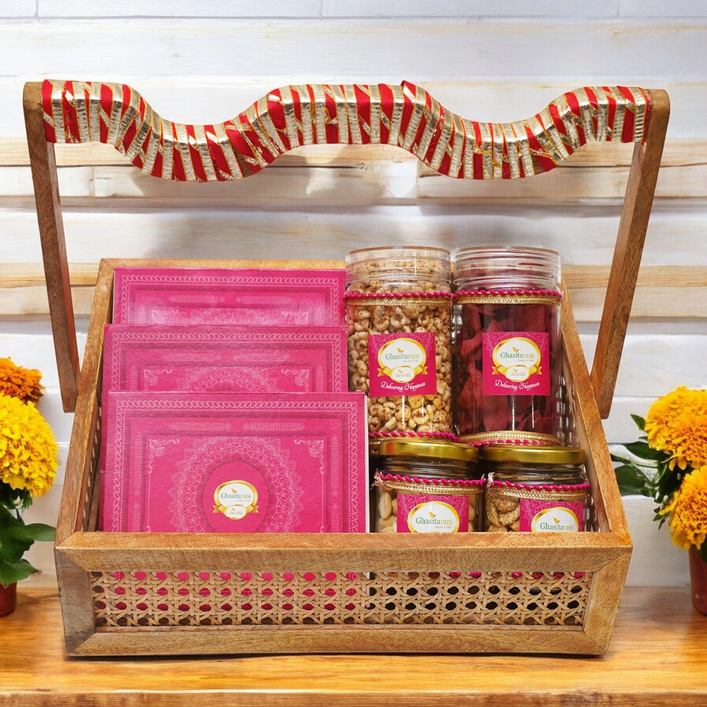 A beautiful Wooden rattan Basket adorned beautifully with lace containing a box of Gud Til Gachak (200 gms), Khajoor (200 gms), Mawa til Laddoo (200 gms), 4 jars containing Beetroot chips (80 gms), Wheat puffs( 60 gms), Peanuts (100 gms), and Gud Til Revadi (100 gms). Net Weight: 940 gms.