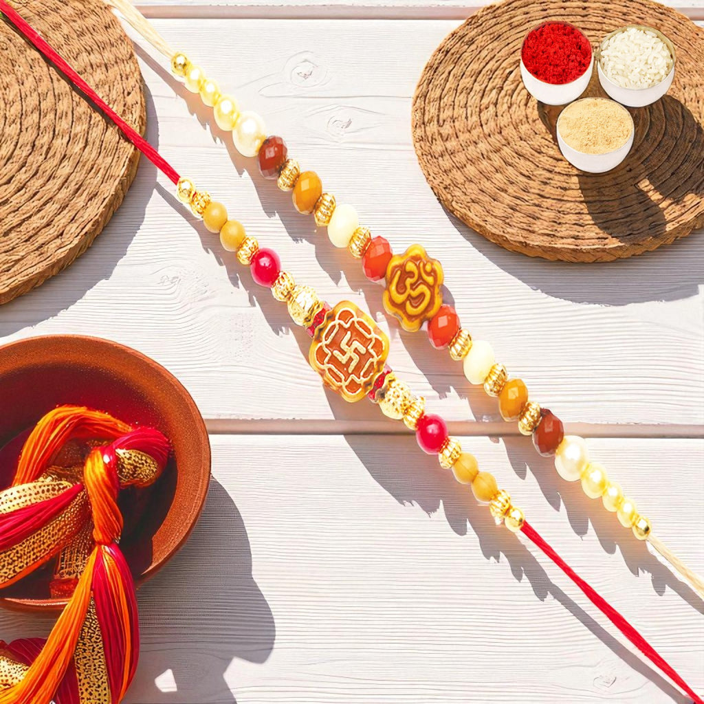 Set of 2 abc35 and abc105 om rakhis- Set of 2 beautiful traditionally designed with beads and stones to make it unique in its own way. . Free Roli, Chawal and chandan pouches go along with this product.
