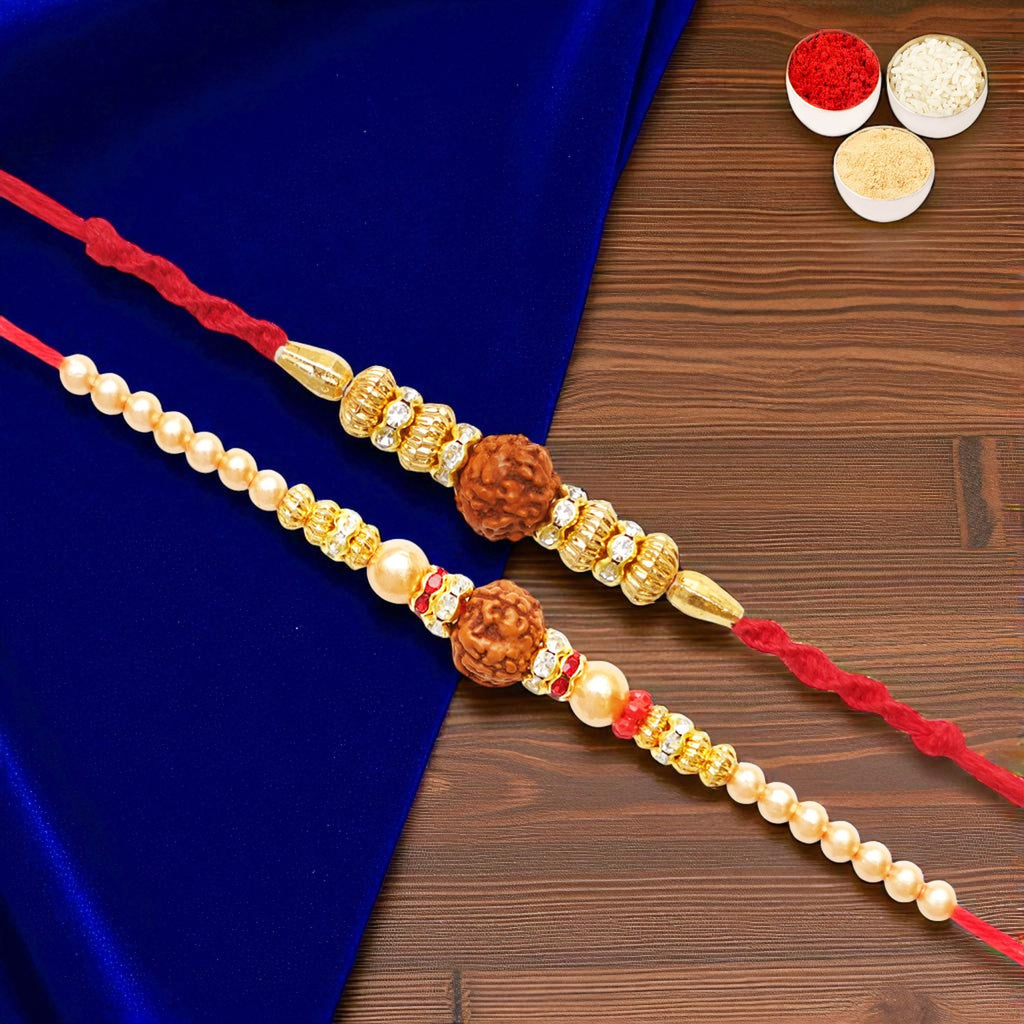 Set of 2 y3 and y81 rudraksh rakhis-Set of 2 beautiful traditionally designed with beads and stones to make it unique in its own way. . Free Roli, Chawal and chandan pouches go along with this product.